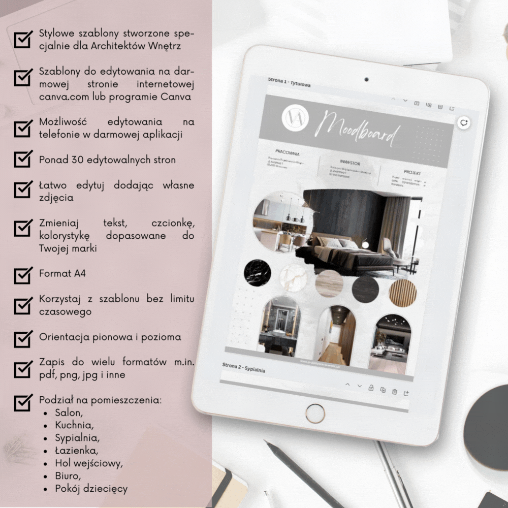 Specjalnie dla projektantów wnętrz, stworzyliśmy szablony, które ułatwiają tworzenie imponujących moodboardów bez spędzania wielu godzin na żmudnej pracy.